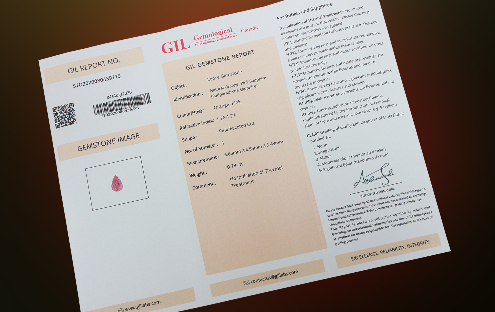 GIL's Full Report or Gemstone Identification Report comes in a standard A4 size (21.0 x 29.7 cm) hard cover. The report identifies the gemstone and sometimes upon client's request, we also state the origin of the gem whenever possible. Gem Dealers often use our certificates to add value to their gemstones. In the bottom right hand corner of the report is GIL's Security Seal that will identify the Report to be authentic.