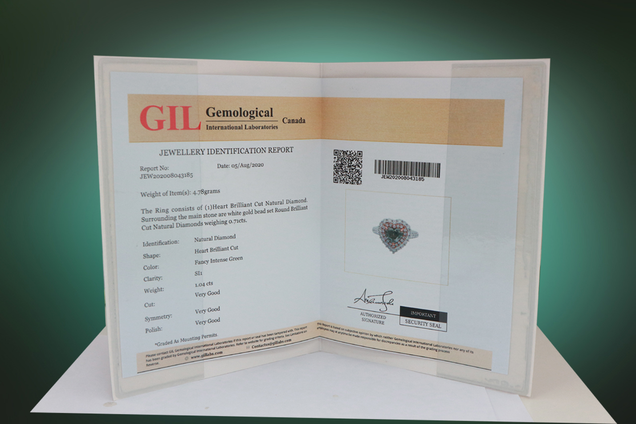 GIL's Jewelry Report is more complex than the analysis of loose stones. Without dismantling and disassembling pieces from the jewelry, GIL provides a statement listing the quantity of gemstones featured in the piece as well as a grading report of the gemstones weight, shape, color, clarity, cut and measurements. Clear documentation and photographs are issued for every item. These standardized photos are extremely useful for consumers, showing details of craftsmanship that may not be visible otherwise.