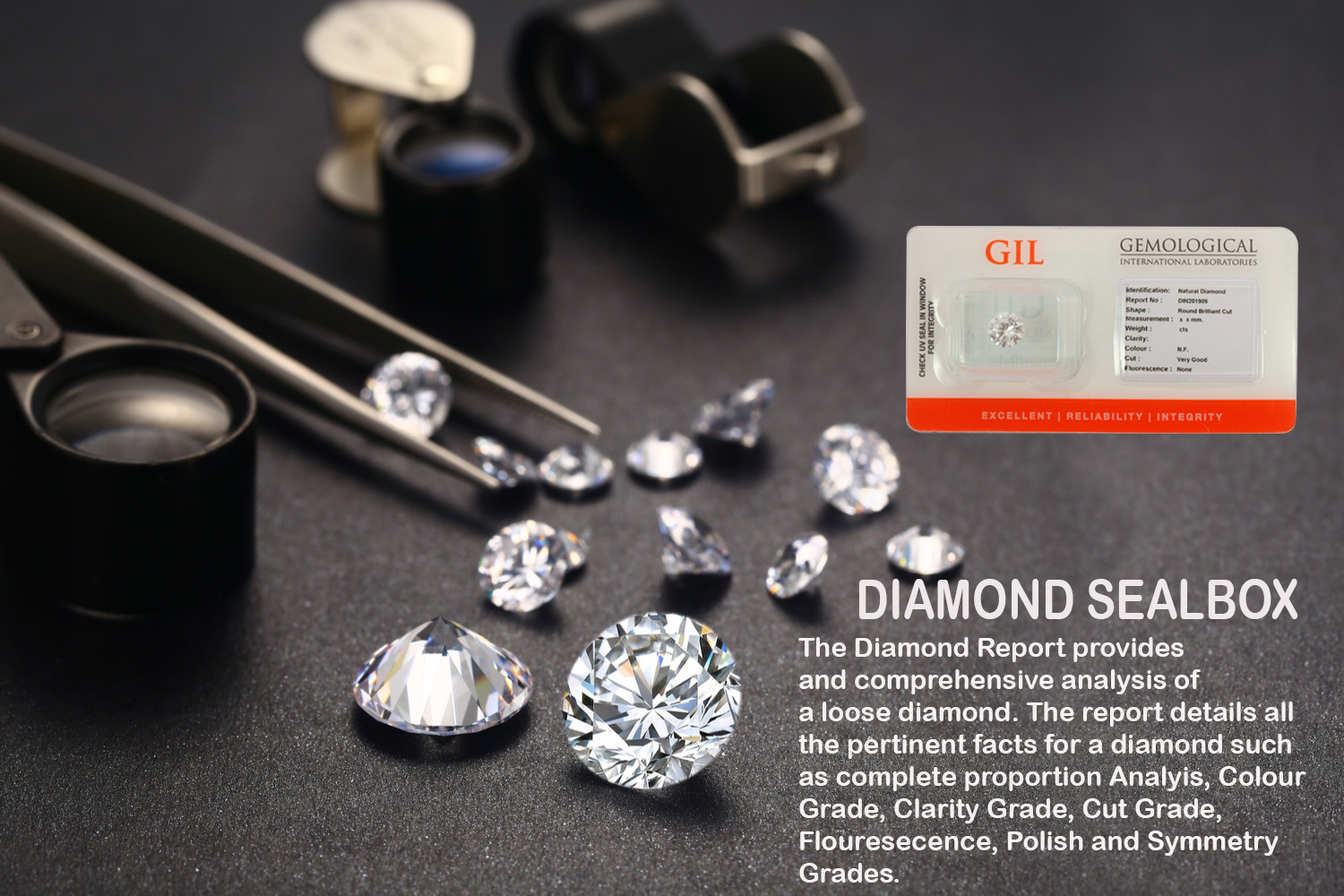 GIL offers an advanced sealing system for loose diamonds in which a diamond is sealed in a secure and tamper-proof casing. The GIL Sealing System is the best way to safeguard your diamond against being substituted, chipped, fractured, or otherwise damaged before you have it set into jewelry or while it is not in your possession. Once GIL has issued a Diamond Certificate, on your request the diamond is sealed in the Seal Box casing with its individual GIL Diamond Certificate number. The seal has a number of security features including electrostatic security bars, pressure-sensitive transparent adhesive and Cryptoprint text which only becomes visible after opening the seal. It is therefore impossible to tamper with the seal.